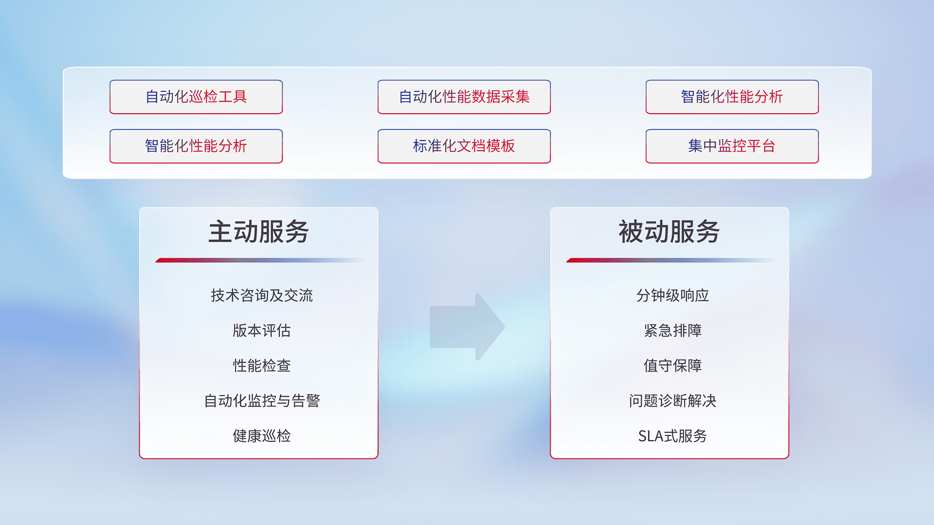 智能化工具和标准化文档,,保障服务质量,,提供主动服务(包含技术咨询、、、、版本评估、、、、性能检查、、、、自动化监控与告警、、健康巡检)和被动服务包含(分钟级响应、、、、紧急排障、、、值守保障、、问题诊断解决、、、SLA服务)。。。