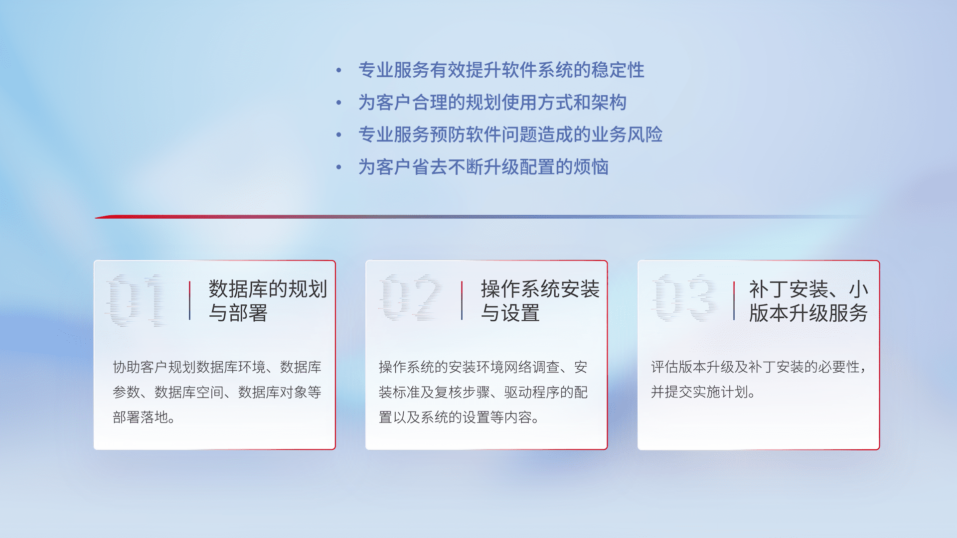 为客户提供软件规模升级、、、快速部署、、、按需配置的专业服务,,,,从数据库的规划与部署到操作系统的安装与设置,,再到补丁安装和小版本升级提供支持。。