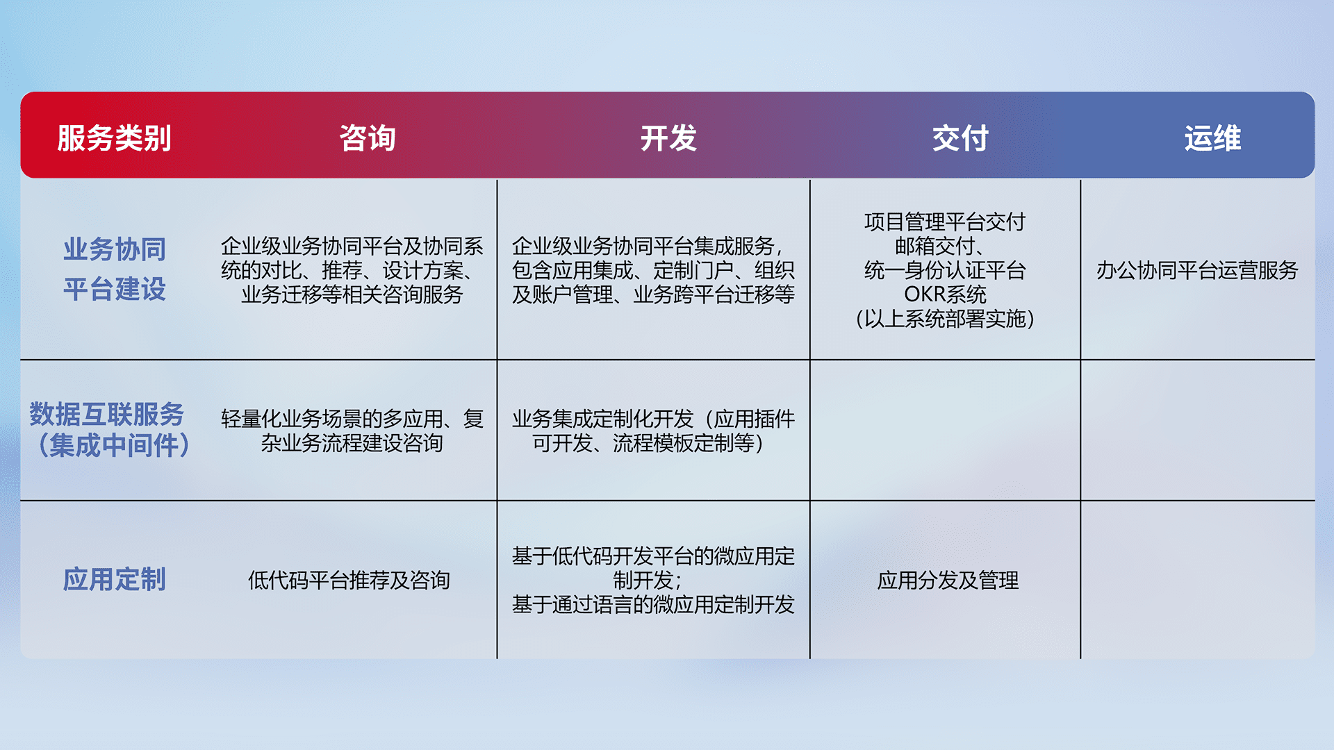 针对钉钉、、、、企微、、、IDaas等平台级产品提供产品的规划、、、、方案、、、、交付、、定制化开发等服务,,,实现如统一协同办公、、、智能客户服务、、、、混合会议管理、、智能数据查询、、等业务场景,,实现数字化转型。。。。